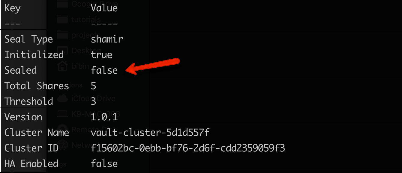 Now if you check the vault status, it should say false for sealed parameter as shown below.