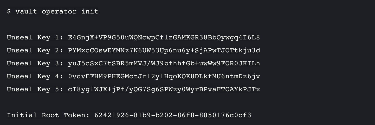 It will output 5 unseal keys and a root key as shown below. Note down those keys. Root key will be used to login to vault CLI and UI.