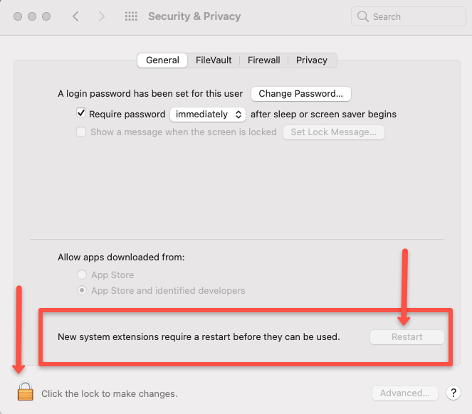Step 3: Select the General tab and enable the lock icon to make changes. Then there will be an option to enable system extensions. Instead of the restart, you will see another option. Once you click that, you will see Oracle on the list. Enable that in the checkbox. It will ask for a system restart and restart the system.